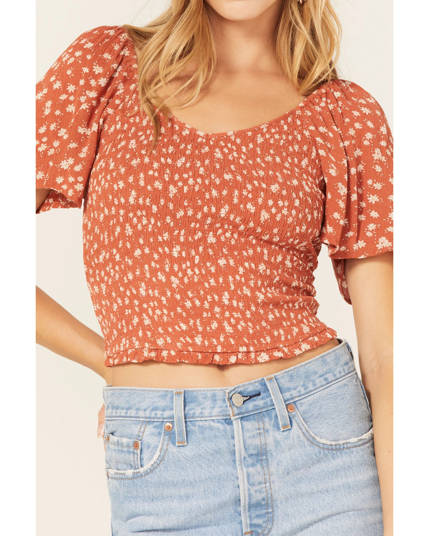 - Rust copper with allover white ditsy floral pattern